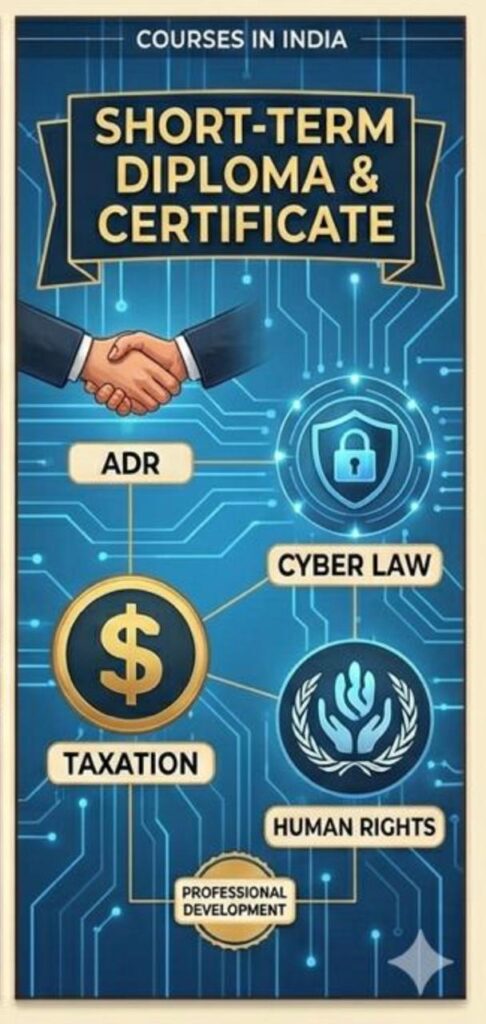 Short-Term Diploma & Certificate Courses These are specialized programs (6 months to 1 year) aimed at building expertise in niche areas without requiring a full degree. Popular Areas: Cyber Law, Taxation Law, Human Rights, Labour Laws, and Alternative Dispute Resolution (ADR).Eligibility: Usually open to both students and working professionals.